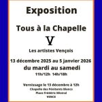 Du 13 décembre au 5 janvier à la Chapelle des Pénitent Blancs décembre 2025 Vernissage : samedi 13 décembre à 12H. Tous à la Chapelle V met à l’honneur une sélection d’artistes Vençois venus partager leur univers au cœur des Pénitents Blancs. L’occasion pour le public de découvrir une diversité de regards, de techniques et de […]