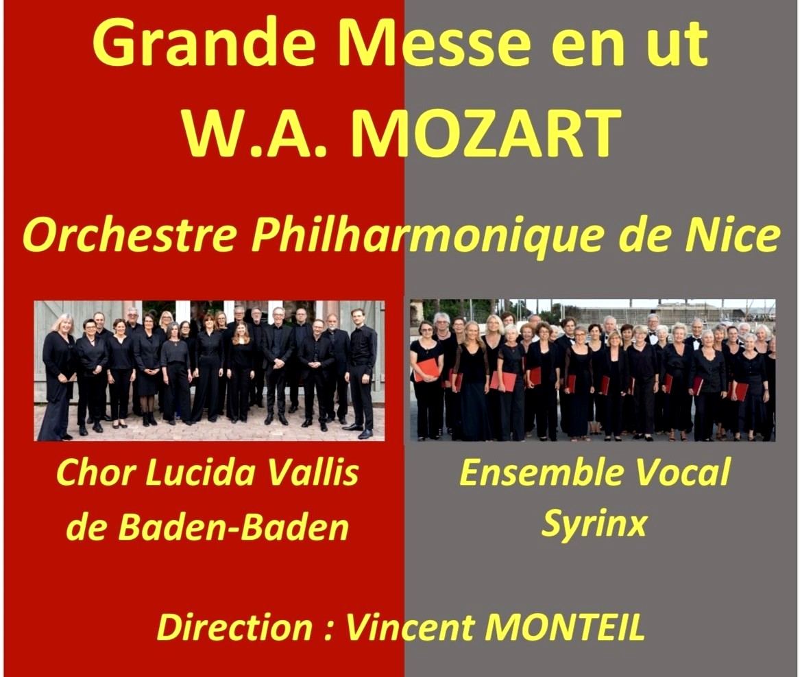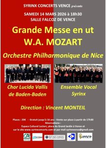 Le prochain concert SYRINX, Samedi 14 Mars 2026 à 18h30, Salle Jacques Falcoz réunira le CHOEUR «LUCIDA VALLIS» de BADEN-BADEN, L’ENSEMBLE VOCAL SYRINX & L’ORCHESTRE PHILHARMONIQUE DE NICE, pour la GRANDE MESSE EN UT de Wolfgang Amadeus MOZART.