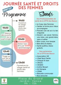 Que vous soyez en quête de conseils en prévention, d’informations sur vos droits ou d’un moment d’échange avec des professionnels locaux, cet événement est conçu pour toutes les femmes, quels que soient leur âge ou leur origine.