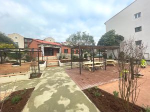 Les extérieurs entièrement transformés offrent un lieu inclusif et intergénérationnel de 1235 m² composé d’un jardin d’agrément, un potager, des zones ombragées, un jardin des sens, un espace forme et détente, un espace récréatif (ping-pong & pétanque), des jeux pour enfants (balançoires et jeux à ressort) et un cheminement accessible aux PMR.